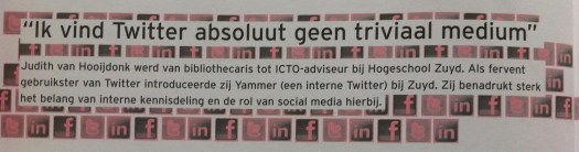 Door mijn getwitter over mijn werk als ICTO-adviseur bij Hogeschool Zuyd, door Yammer (een interne Twitter) te introduceren in onze organisatie, door constant aandacht te vragen voor het belang van interne kennisdeling (wat met behulp van social media heel gemakkelijk kan) en door het verzorgen van trainingen social media, ben ik inmiddels vraagbaak geworden over dit onderwerp en deel ik mijn passie en kennis met velen in de organisatie.