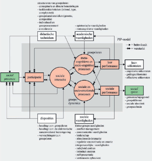 Kreijns licht het (online) samenwerkend leren toe aan de hand van het PIP-model (Participation, social Internaction, Performance) die de relaties tussen de begrippen van samenwerkend leren laat zien. Hij gaat in op hoe het groepsleren te structureren is en hoe de groepsdynamica is te reguleren en welke academische en sociale vaardigheden daarbij nodig zijn.