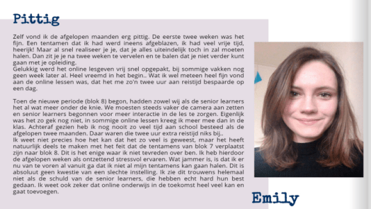 Studenten waren positief verrast dat veel docenten ook goede kanten zien aan online onderwijs.. Docenten hebben elkaar in de beginperiode ook goed geholpen.