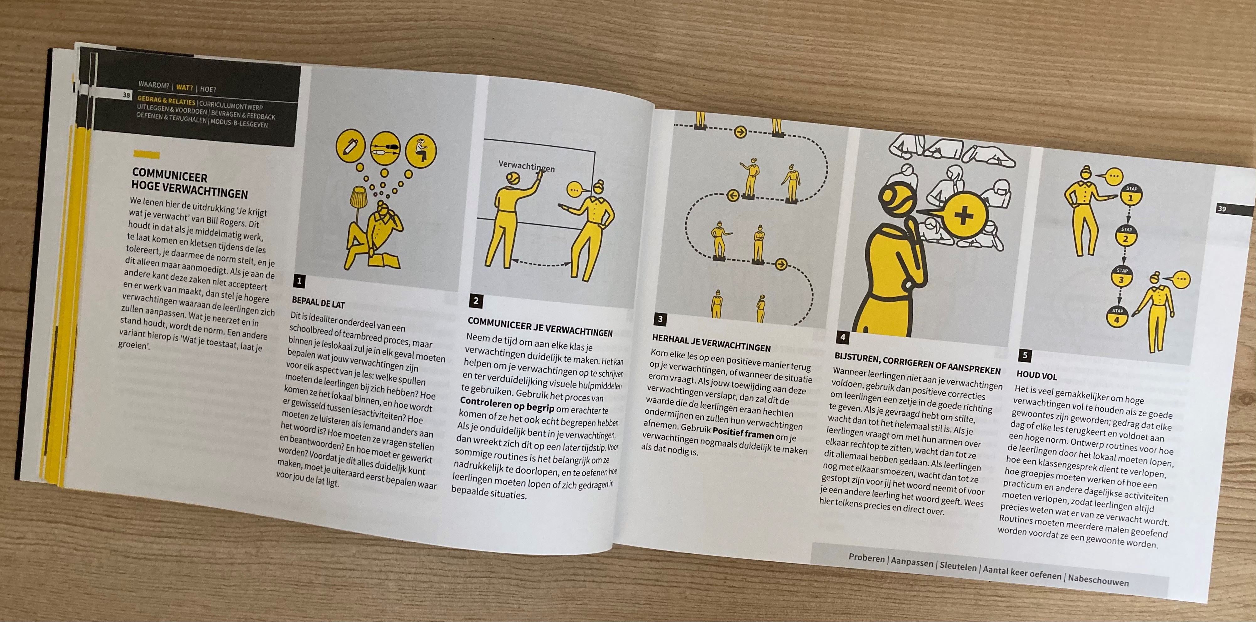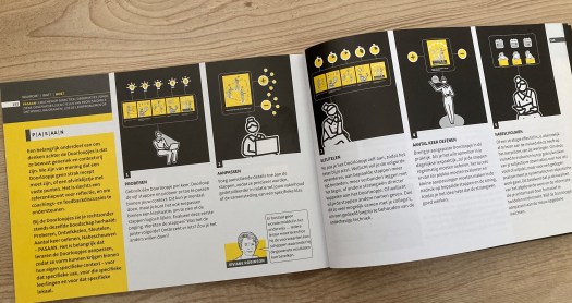 Het eerste dat opvalt als je het boek (uitgeverij Phronese) in handen krijgt is de vormgeving: het afwijkende formaat (landscape) en de knalgele kleur. Het boek bladert heerlijk en je ziet meteen de vele illustraties in een overzichtelijke lay-out. Het boek telt 166 pagina’s en is opgedeeld in 3 secties: Waarom, Wat en Hoe.