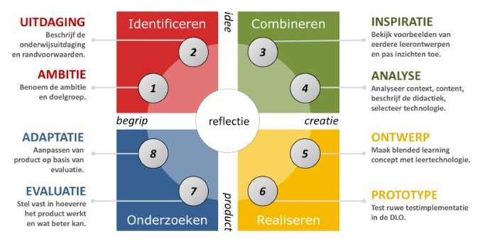 Zie de website onderwijsontwikkeling.zuyd.nl voor toelichting op de acht stappen van DC4E. Het bijbehorend ondersteuningsmateriaal (hier en hier) is Nederlandstalig. Er is ook een pagina met Engelstalige informatie.