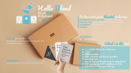 ‘Hello Blend’ ; hiermee worden geen gerechten gemaakt op basis van recepten, maar onderwijskundige producten of ontwerpen met betrekking tot blended onderwijs. ‘Hello Blend’ is net als Hello Fresh een toolbox met recepten en materialen (bijvoorbeeld tools & instructievideo’s). Er is een analoge box beschikbaar met recepten die verspreid kunnen worden onder de docenten. De recepten verwijzen naar een webapplicatie waar aanvullende informatie of ondersteuning is te vinden.