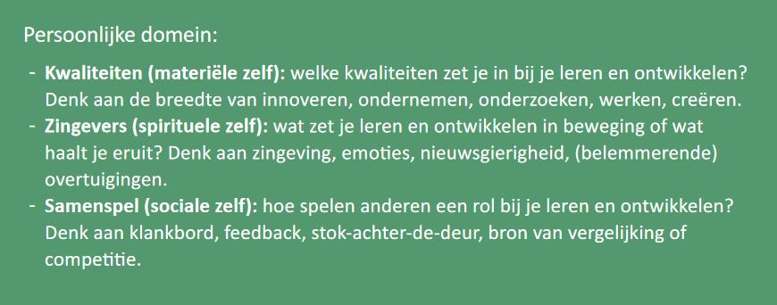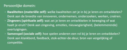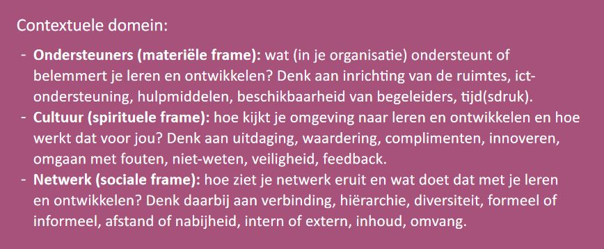 Vooral de vragen van het contextuele domein (bovenkant model) en het persoonlijke domein (onderkant van het domein) vind ik hierbij erg helpend.