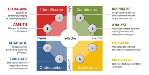 Zo ontstaat de bekende ‘golf’ van onderwijselementen zoals we die kennen van de Blended Learning Wave (deel 3 van deze reeks). Reflectie staat bij alle stappen centraal: het model dwingt je om telkens kritisch te bekijken wat de opbrengst is. Hieronder zie je het model en de acht stappen schematisch weergegeven.