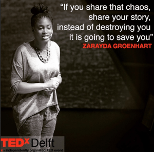 Op 27 februari 2015 ben ik naar TEDxDelft geweest waar ik de indrukwekkende talk van Zarayda Groenhart heb gezien. De boodschap van  Zarayda “if you share that chaos, share your story, instead of destroying you it is going to save you” is zeker een idea worth spreading!